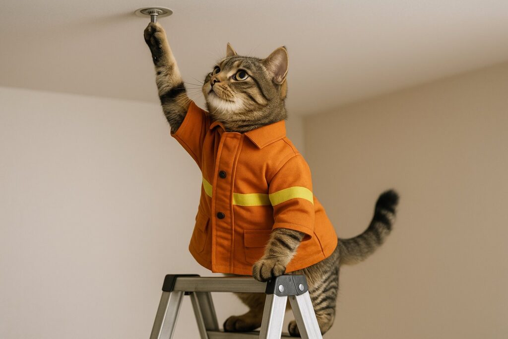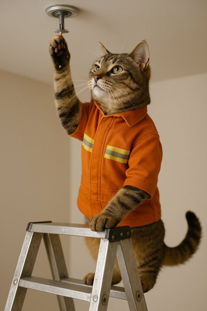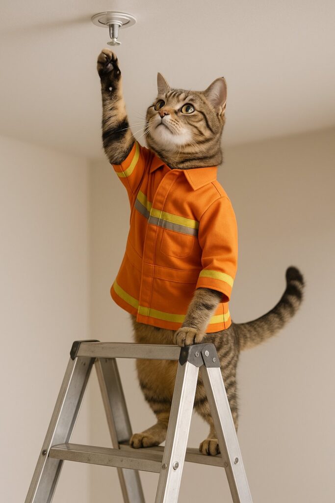 A tabby cat in an orange uniform (no helmet) stands on a metal stepladder, reaching up and lightly touching something above with one paw. The cat looks focused, as if inspecting or adjusting a small object. The scene is indoors, with a clean, neutral background. The image is horizontal, realistic photo style.