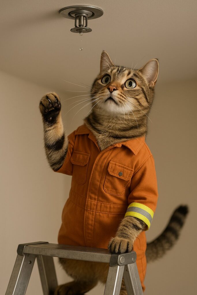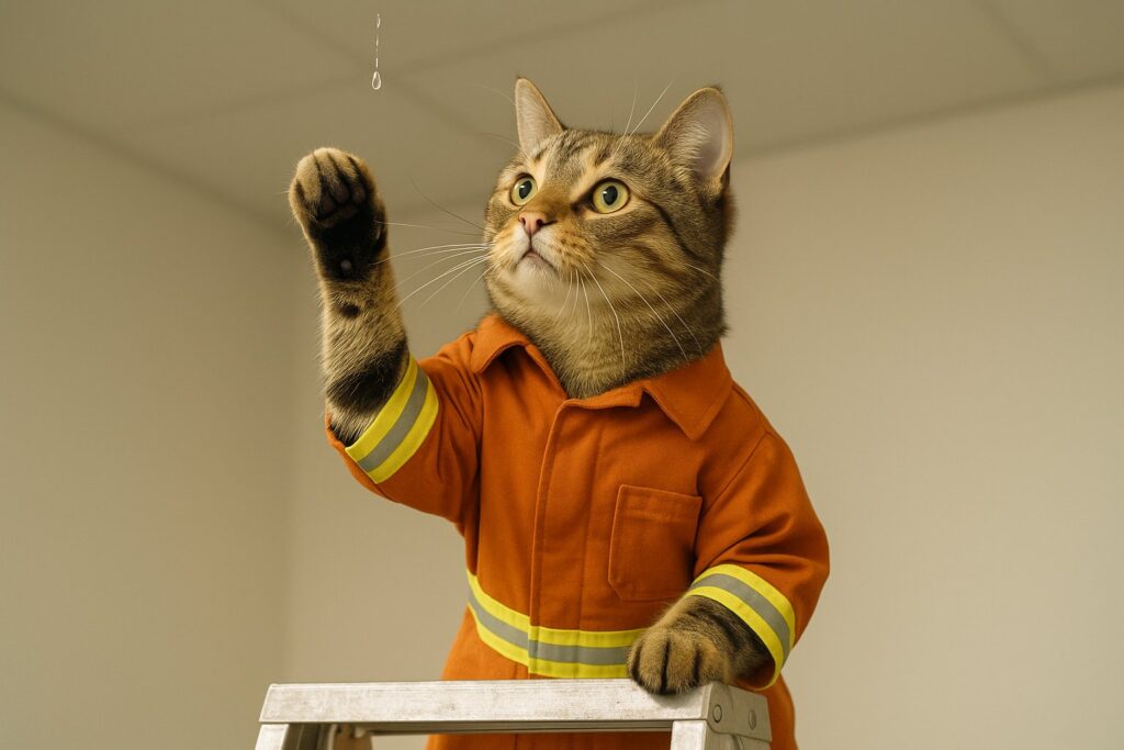 A tabby cat in an orange uniform (no helmet) stands on a metal stepladder, looking up with a surprised face. One paw is raised near something above, and a small droplet of water is falling from above. The cat’s expression shows mild confusion, with ears slightly back. The image is horizontal and in realistic photo style.