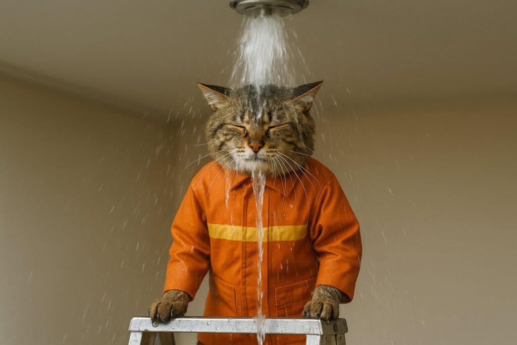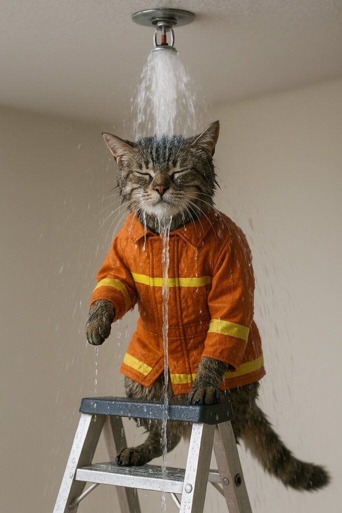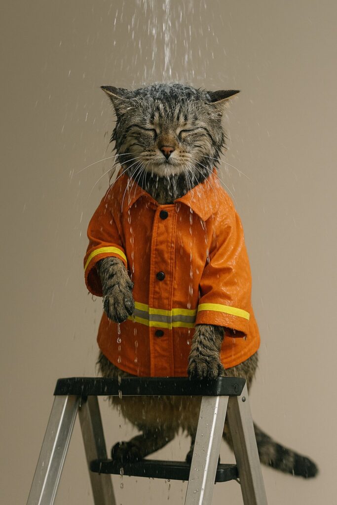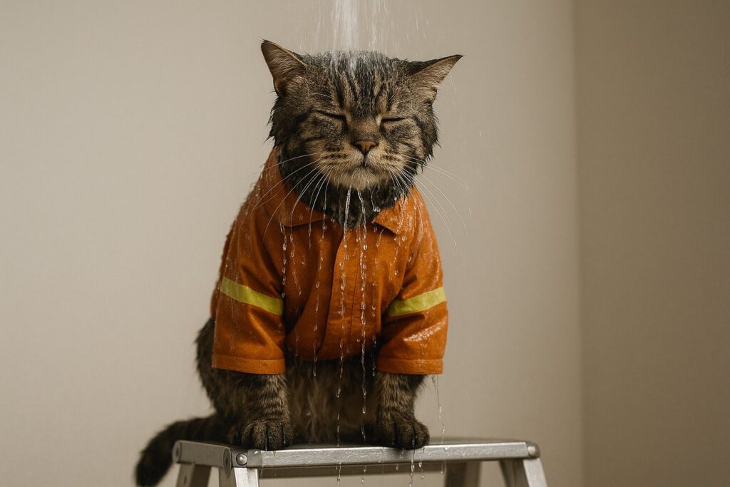 A tabby cat in an orange uniform (without helmet) stands still on a metal stepladder. Suddenly, water begins pouring from above. The cat is completely drenched in seconds, its fur plastered to its body. The cat remains frozen, with squinted eyes and a shocked expression. The cat does not speak.