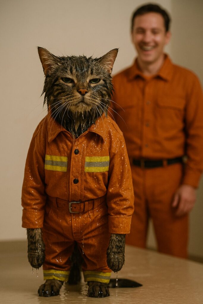 A soaked tabby cat in an orange uniform (no helmet) stands still on the floor, completely drenched and staring blankly forward. Water drips from its whiskers and fur. In the background, a person wearing matching orange work clothes is smiling warmly or chuckling softly, watching the cat. The person stands relaxed, with arms by their side. The background is a plain indoor wall. Vertical layout, realistic photo style.