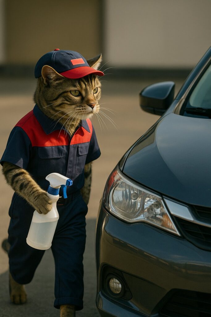 A realistic photo-style image of an anthropomorphic cat standing in front of a parked car, wearing a gas station attendant uniform. The cat is holding a spray bottle in one paw and staring seriously at the windshield. The car’s front (hood and headlights) is partially visible in the background. Horizontal composition, no text.