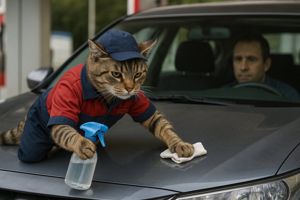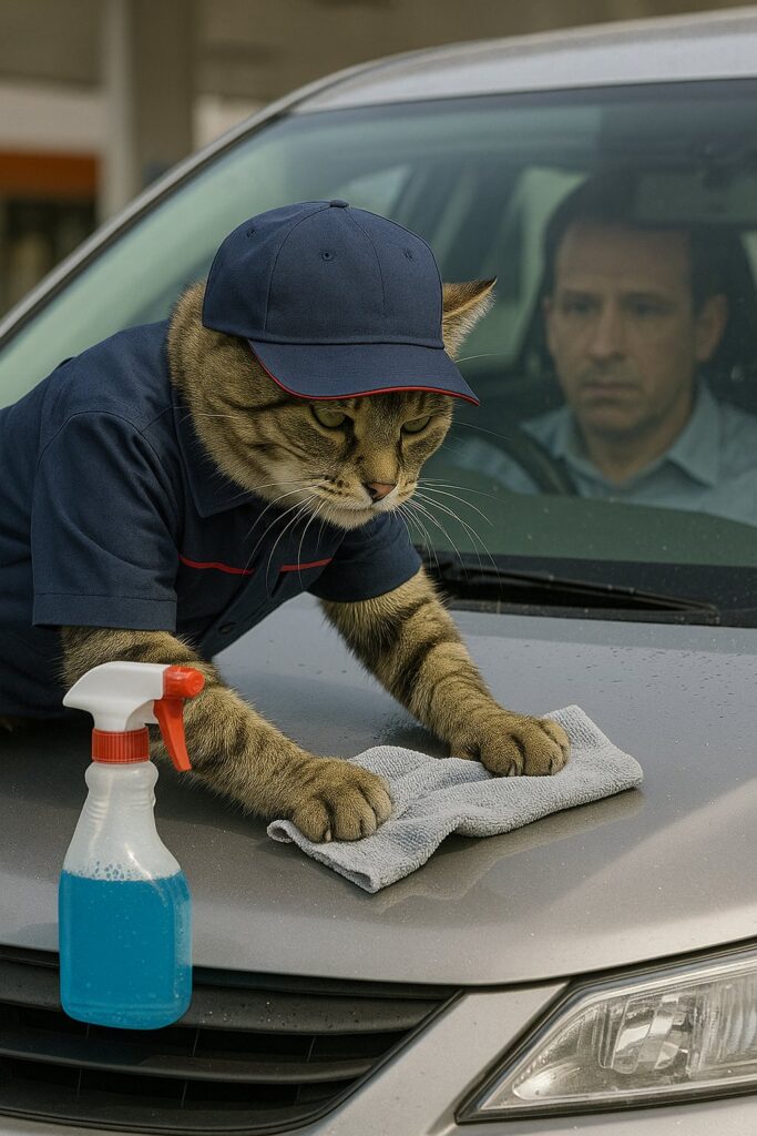 A realistic video of an anthropomorphic cat in a gas station attendant uniform cleaning the windshield of a parked car. The cat is on top of the hood, using a towel with quick, focused movements, and a spray bottle is resting nearby. The cat’s face shows intense concentration. A human driver watches curiously from inside the car. The camera captures both the cat’s effort and the human’s reaction through the windshield.