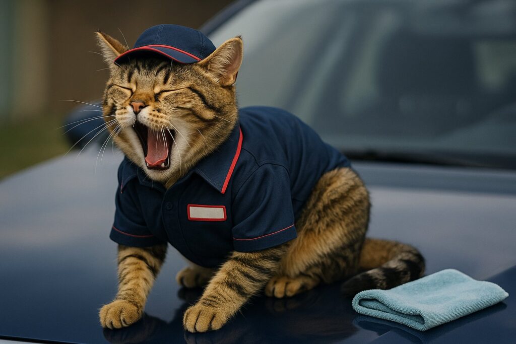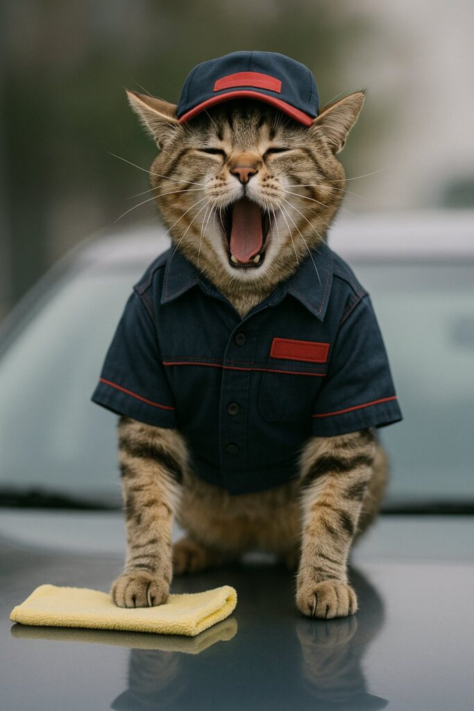 A realistic video of an anthropomorphic cat in a gas station attendant uniform on top of a parked car’s hood. The cat finishes wiping the windshield, drops the towel, and then stretches its back dramatically with a huge yawn. The cat’s body language is exaggerated to show it's tired. The shot focuses on the cat’s movement and facial expression.