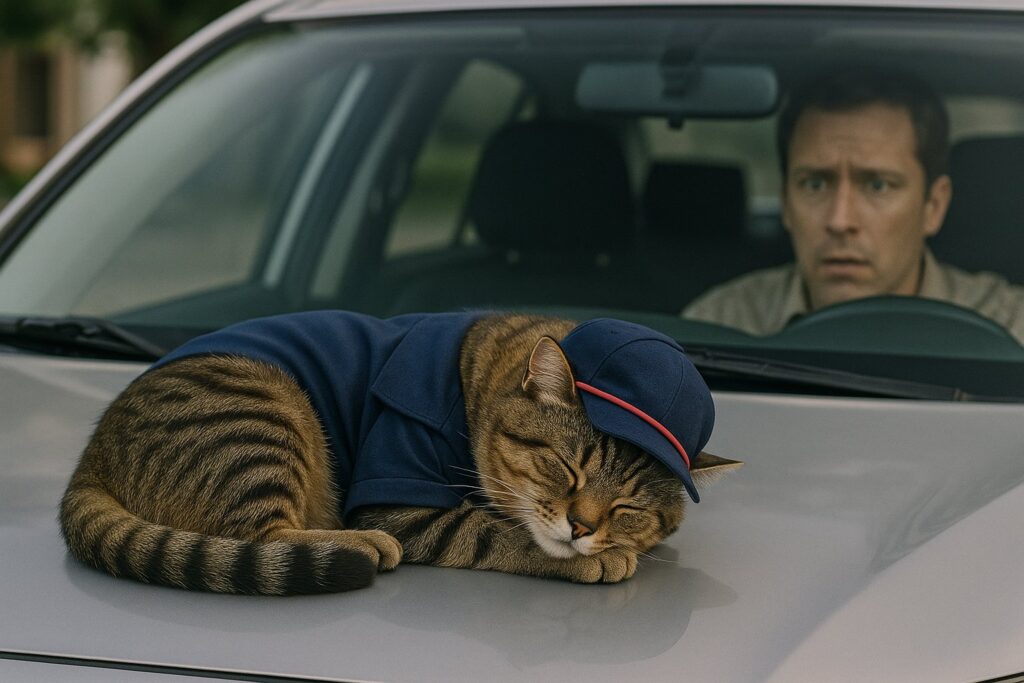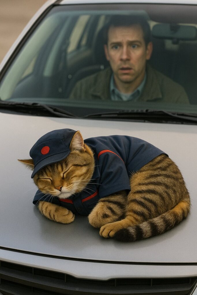 A realistic video of an anthropomorphic cat in a gas station attendant uniform falling asleep on the hood of a car. The cat slowly curls into a ball and closes its eyes, resting peacefully. A human driver can be seen inside the car, looking at the cat through the windshield with a confused or surprised expression. The camera focuses on both the cat’s cozy sleeping posture and the human reaction through the glass.