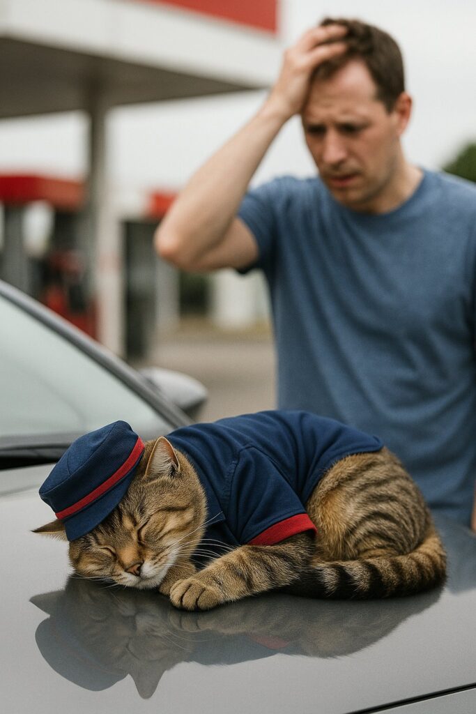 A realistic photo-style image of an anthropomorphic cat in a gas station uniform, deeply asleep on the hood of a parked car. The cat is curled up peacefully, wearing a navy gas station cap. Standing beside the car, a human is shown holding their head in frustration, clearly reacting to the cat’s behavior. Horizontal composition, no text.