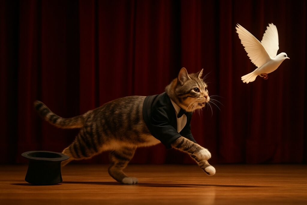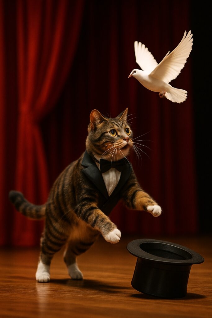 A realistic video of an anthropomorphic brown tabby cat performing on stage in a magician’s tuxedo. The cat holds a top hat and looks surprised as a white bird suddenly flies out of it. The cat watches the bird with wide eyes, and the audience can sense the magic moment. Warm stage lighting enhances the theatrical atmosphere.