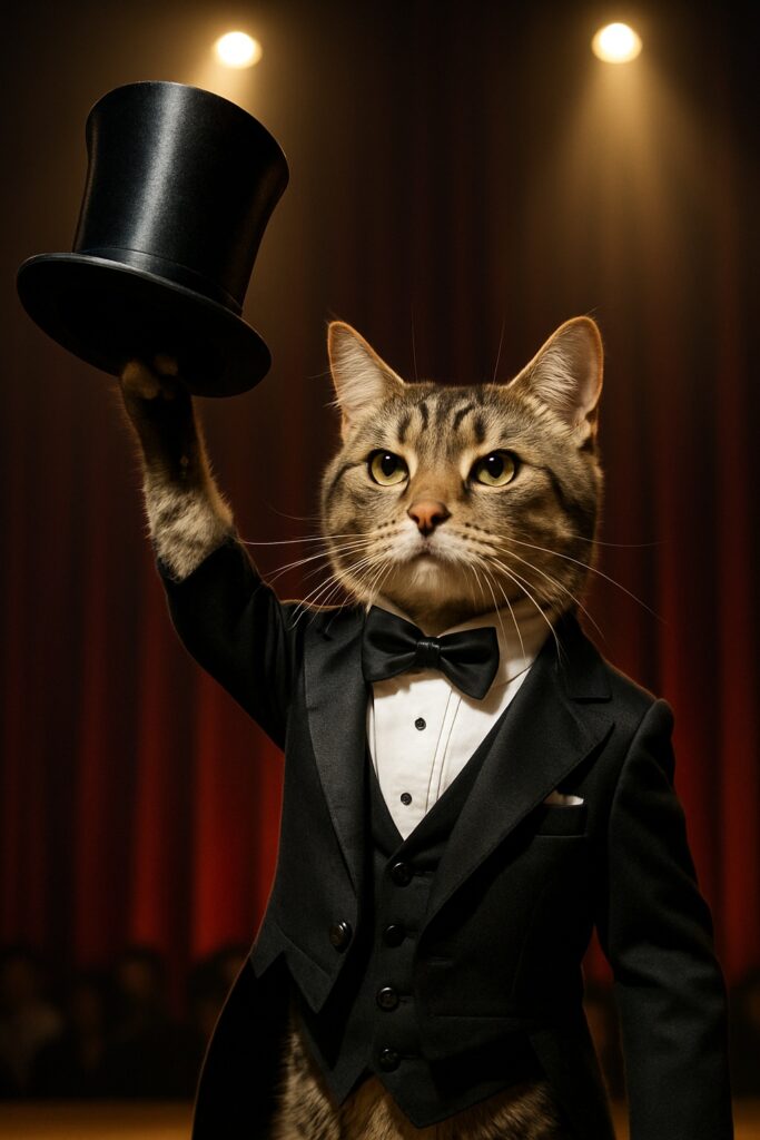 A realistic video of an anthropomorphic cat on a stage wearing a magician’s tuxedo and a silk top hat. The cat raises the hat high in the air and looks out at the audience dramatically, as if preparing to perform a magic trick. Stage lights focus on the cat while the background shows a shadowy crowd. The camera slowly zooms in on the cat’s confident pose.