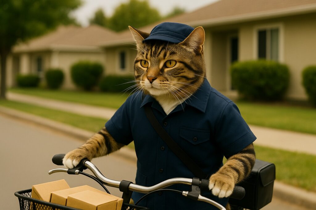 A wide-angle photo showing an anthropomorphic tabby cat in a mail carrier outfit, standing beside a bicycle with a basket full of letters and small packages. The cat looks forward with a serious expression, ready to begin deliveries. The setting is a sunny suburban street. Realistic style.