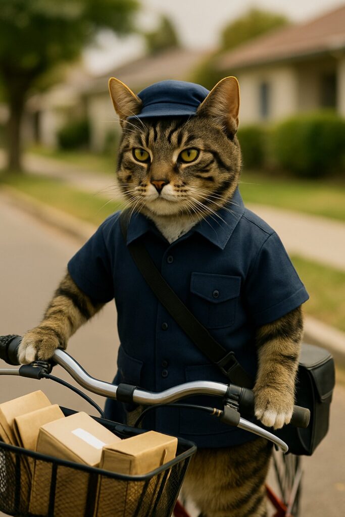 A full-body photo of an anthropomorphic tabby cat wearing a mail carrier uniform, standing next to a red bicycle with a mail basket. The cat looks serious and determined, as if about to start a delivery route. The background is a residential street. Photorealistic style.