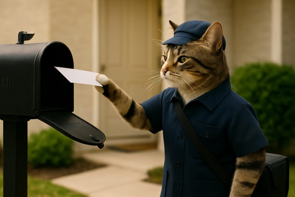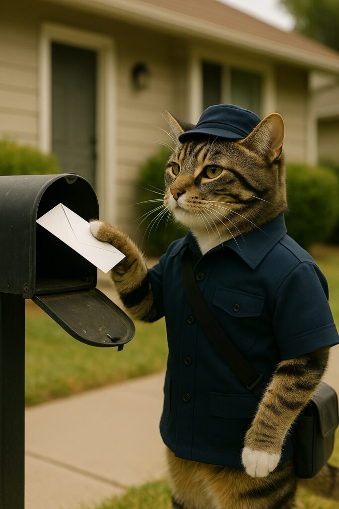 An anthropomorphic tabby cat with dark brown fur and white markings is dressed in a postal worker uniform. The cat stands on two legs in front of a house, stretching out one paw to deliver a letter into a mailbox. The scene is calm and realistic, filmed in natural daylight. The cat appears serious and dedicated to its job.