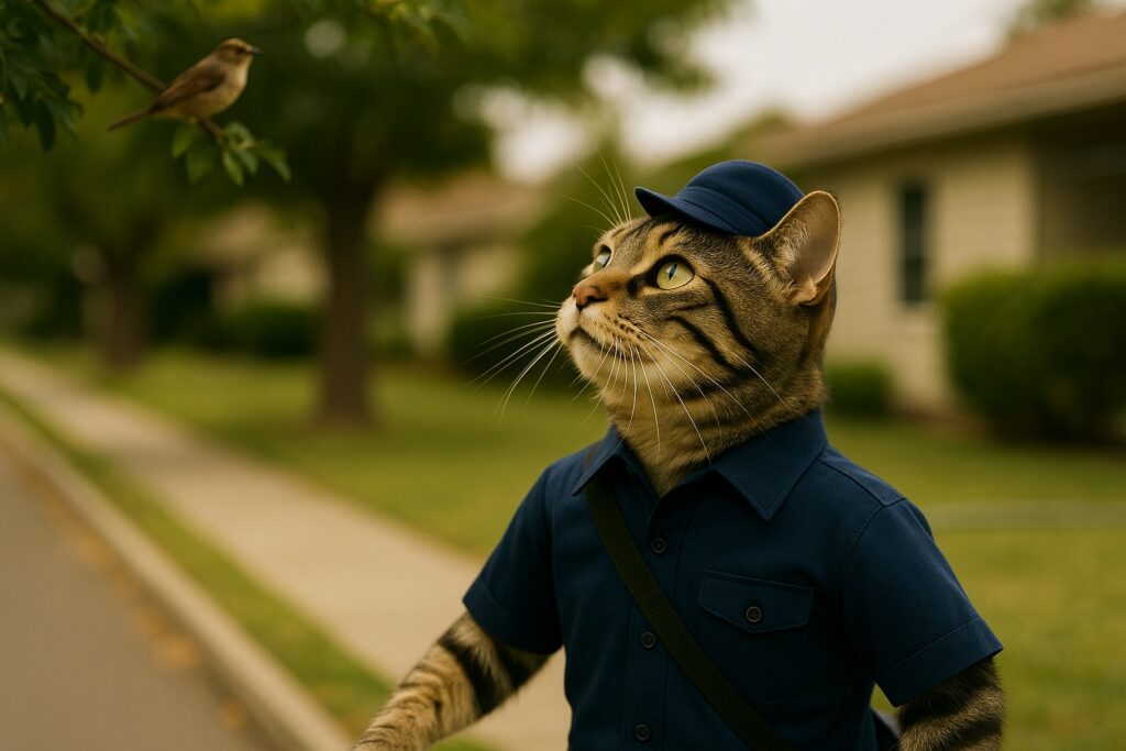A cinematic shot of an anthropomorphic tabby cat mail carrier who suddenly spots a bird perched high on a tree or overhead wire. The cat’s eyes light up with excitement and its body shifts direction, preparing to pursue. The background is a quiet suburban neighborhood. Daylight scene, dramatic mood.