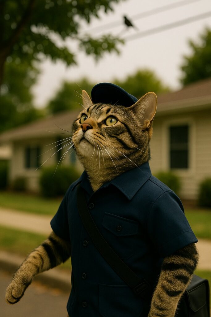 A vertical photograph of an anthropomorphic tabby cat in a mail carrier uniform, standing in front of a house. The cat is staring sharply upward, eyes gleaming with interest. Its body is slightly turned as if preparing to move. In the background, a bird is perched on a tree branch or overhead wire. Daytime, residential setting, cinematic lighting.