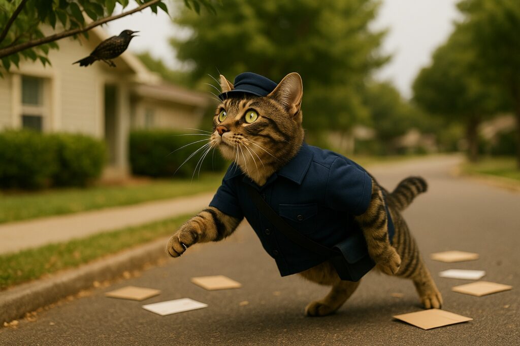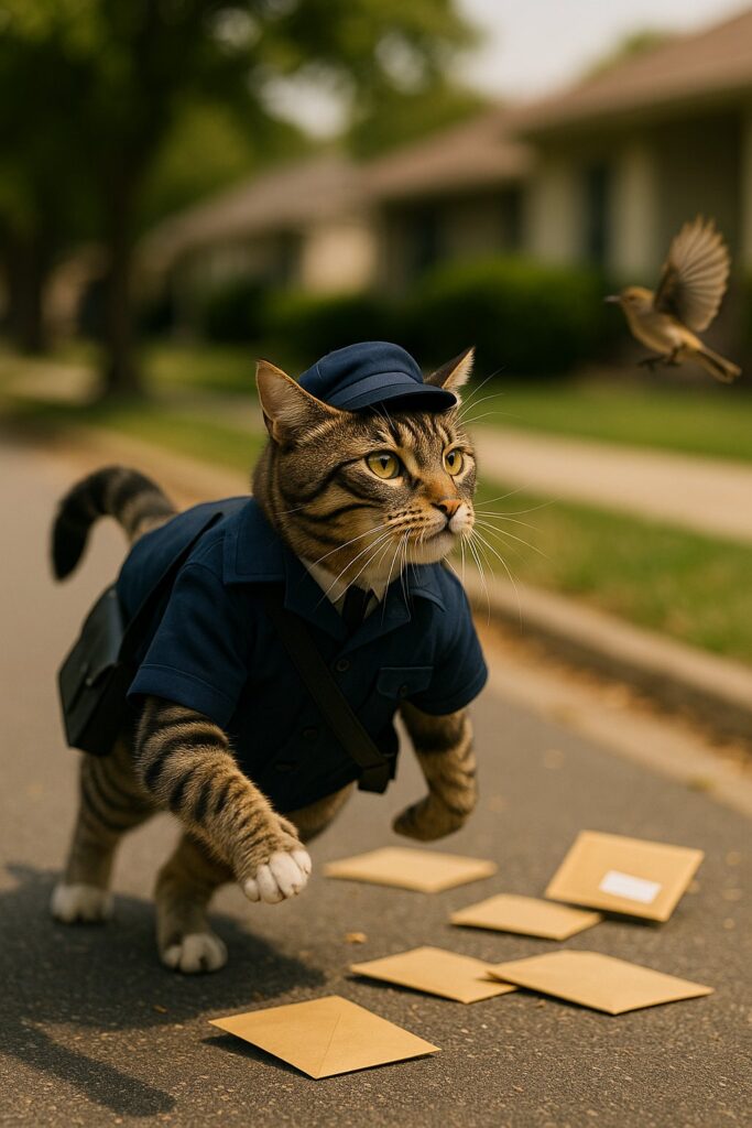 A video of an anthropomorphic tabby cat dressed as a mail carrier suddenly chasing a bird. As the cat runs forward energetically, letters and parcels fall out behind it and scatter on the ground. The bird flaps away ahead. The scene takes place on a quiet street in a residential area during daytime.