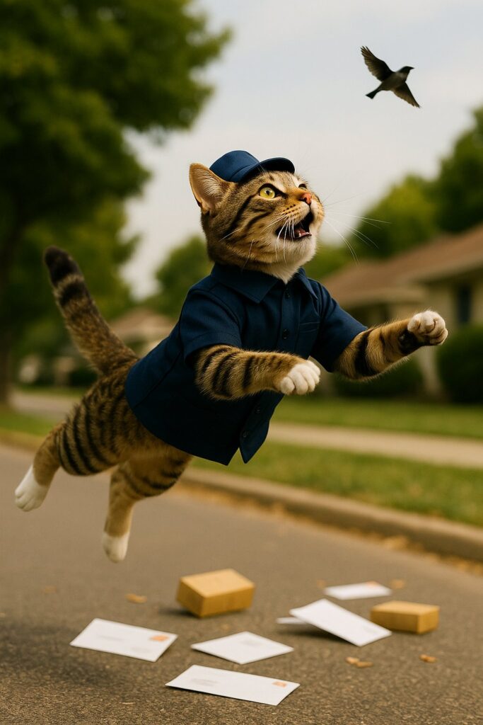 A vertical photo of an anthropomorphic tabby cat with white markings wearing a mail carrier uniform, caught mid-air while leaping toward the edge of the frame. The cat is fully extended in a dynamic pose. A bird is flying above in the background. Daytime setting in a quiet residential area.