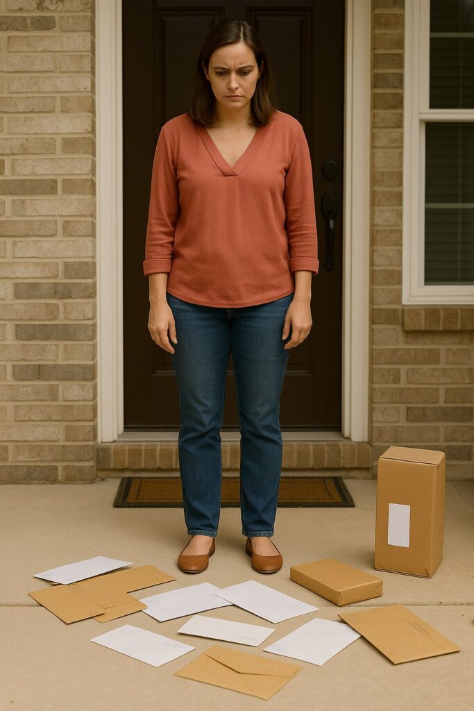 A vertical photograph taken during daytime, showing a suburban front porch. A pile of scattered letters and parcels lies on the ground. A human stands at the entrance, looking down at the mess with a disappointed or baffled expression. The anthropomorphic tabby cat mail carrier is no longer in the scene.
