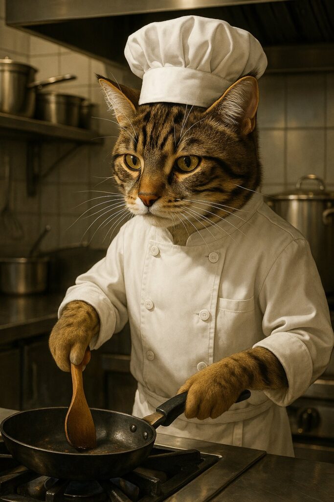 A brown tabby cat with white markings on its face, chest, and front paws is wearing a white chef’s uniform and a chef’s hat. The cat is standing upright in a high-end restaurant kitchen, cooking at the stove. It holds a frying pan in one paw and a wooden spatula in the other. Its paws must look like real feline paws, not human hands. The background features stainless steel appliances, cooking pots, and a clean professional atmosphere. The lighting is soft and natural. No cartoon style, no anthropomorphic hands.
