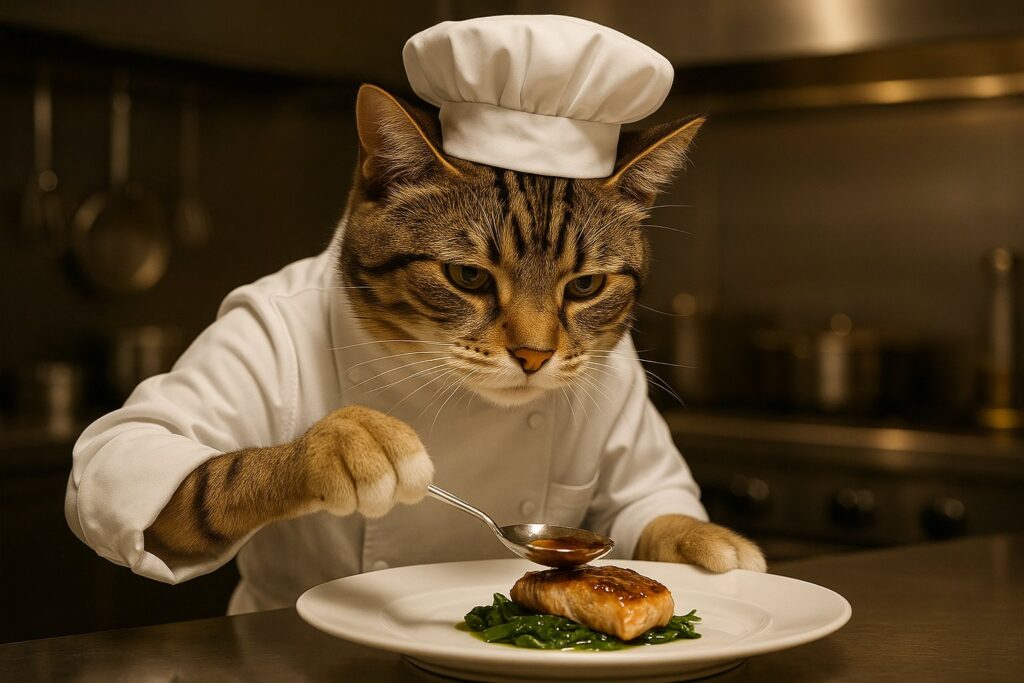 A brown tabby cat with white markings on its face, chest, and front paws is dressed in a clean white chef’s coat and chef’s hat. The cat is carefully plating a gourmet dish on a white plate using a spoon. Its paws are clearly feline — with soft fur and natural cat anatomy. No human fingers or hands. The cat looks focused and professional. The background is a sleek, upscale kitchen with stainless steel surfaces, cooking utensils, and warm lighting. Photorealistic style only. No cartoon elements.