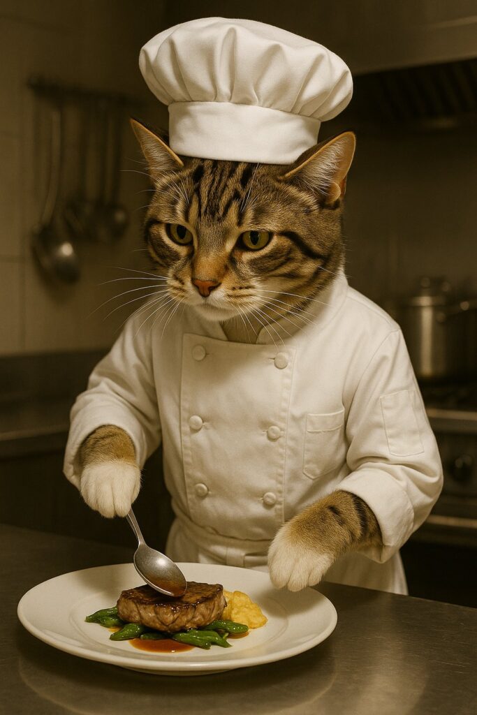 A realistic video of a brown tabby cat with white markings on its face, chest, and front paws, wearing a white chef’s uniform and a chef’s hat. The cat is standing at a stainless steel counter in a professional kitchen, carefully plating a gourmet dish. It uses a spoon to drizzle sauce over a piece of meat on the plate. The cat’s movements are deliberate and focused, like a skilled chef. Its paws are natural and feline — no human hands. The kitchen background features soft lighting and elegant cooking tools.