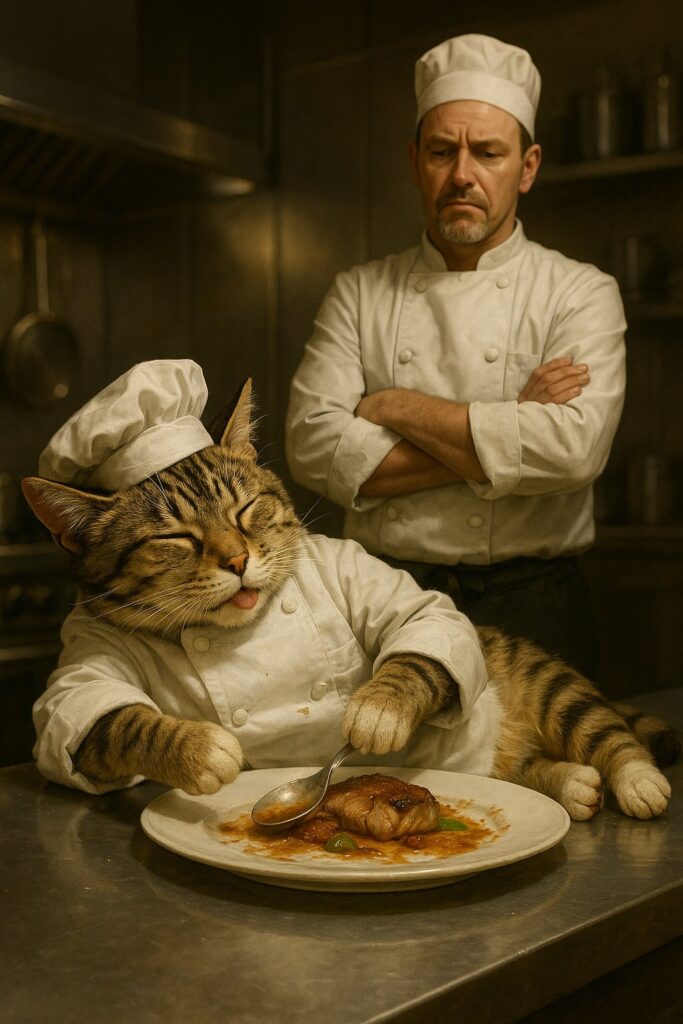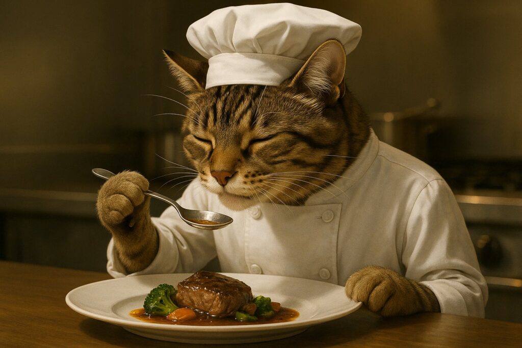 A brown tabby cat with white markings on its face, chest, and front paws is wearing a white chef’s coat and hat, standing in a professional kitchen. The cat is tasting a plated gourmet dish using a spoon, holding it with a natural feline paw — not a human hand. The paws must look like real cat front legs with fur and pads, no fingers, no thumbs. The white plate on the counter contains meat and vegetables in sauce. The cat’s eyes are closed in satisfaction. Background is a clean stainless steel kitchen. No cartoon elements. No human hands.