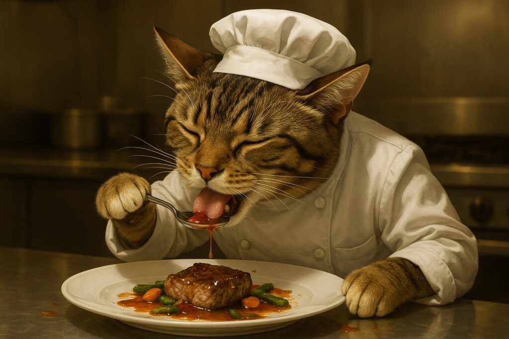 A brown tabby cat with white markings on its face, chest, and front paws is dressed in a white chef’s uniform and hat, standing in a professional kitchen. The cat is leaning slightly forward, tasting a dish directly from a white plate using a spoon. The plate contains a gourmet dish with meat and vegetables, similar to the one it plated earlier. The cat's eyes are slightly closed in concentration or satisfaction. Its paws must look natural and feline — no human fingers. The background shows a clean, stainless steel kitchen with soft lighting. No cartoon elements.