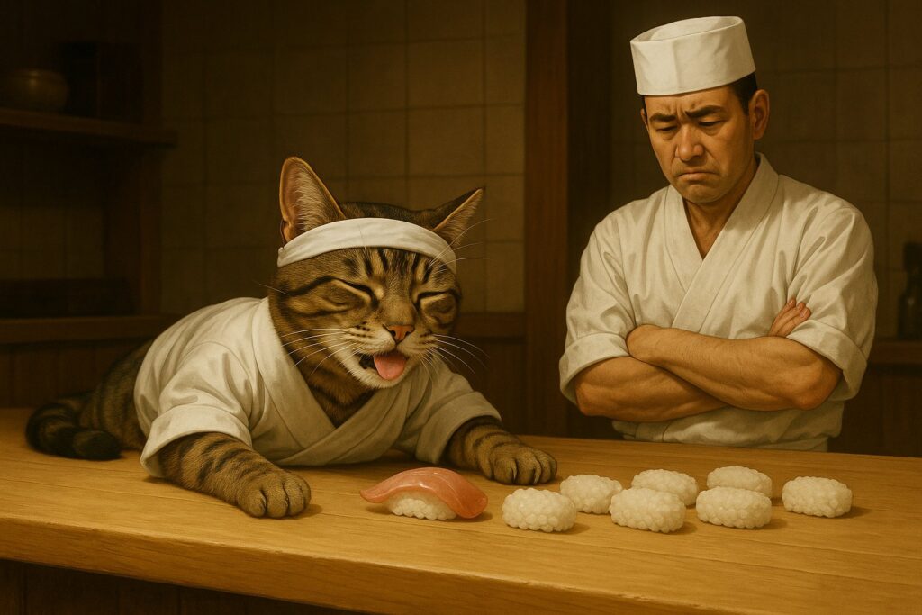 A brown tabby cat with white markings on its face, chest, and front paws is wearing a sushi chef uniform and a white headband. The cat is lying down on the floor behind a sushi counter, eyes closed, with its tongue slightly sticking out in satisfaction. Beside the cat, a human sushi chef in traditional Japanese attire stands, looking down at the cat with a clearly exasperated expression. On the counter in the background, several pieces of sushi are lined up with only rice left β all the fish toppings are missing. The kitchen environment is warm and photorealistic. No cartoon style. No human hands in unnatural positions. Vertical composition.