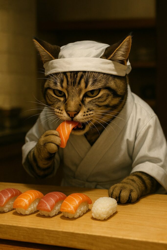 A brown tabby cat with white markings on its face, chest, and front paws is wearing a traditional Japanese sushi chef outfit and a white headband. The cat stands behind a wooden sushi counter in a traditional Japanese kitchen. On the counter, several pieces of sushi are neatly arranged with raw fish on top. One sushi piece has only rice left β the fish topping has been removed. The cat is holding the removed piece of fish with its natural paw and is about to eat it, with a mischievous expression. Warm, photorealistic lighting. No cartoon style. No human hands.