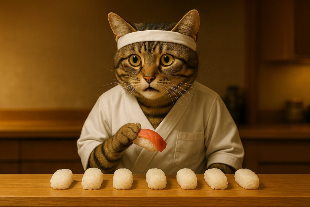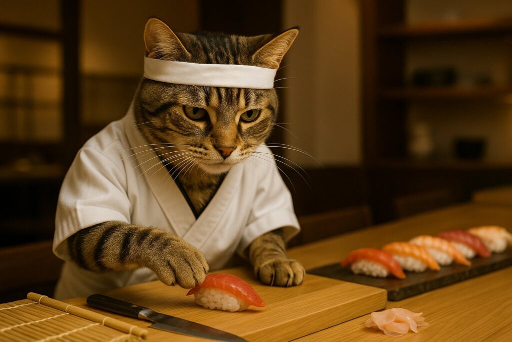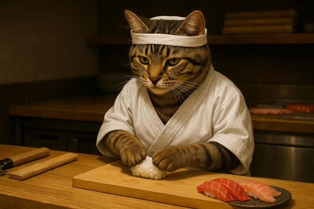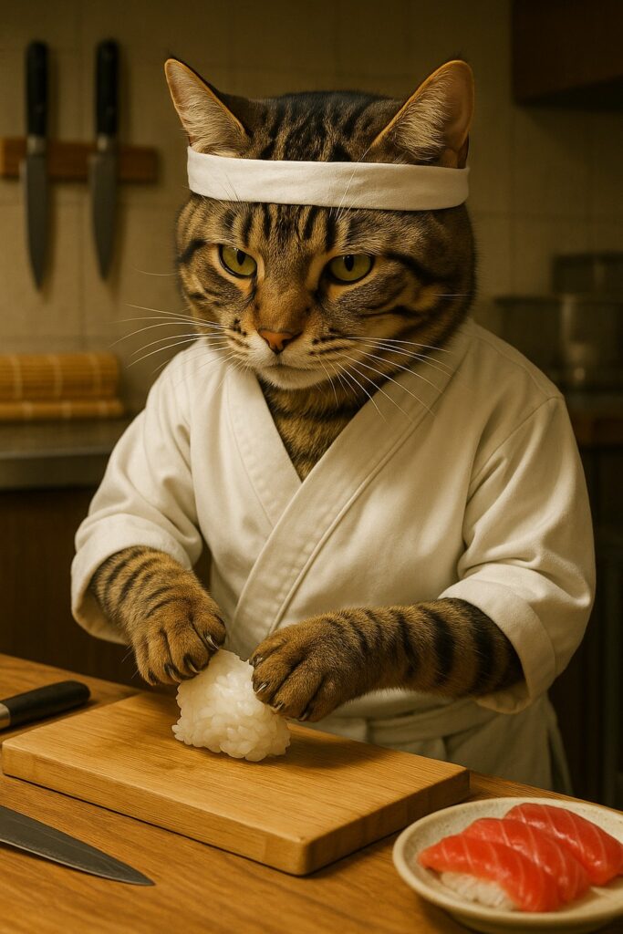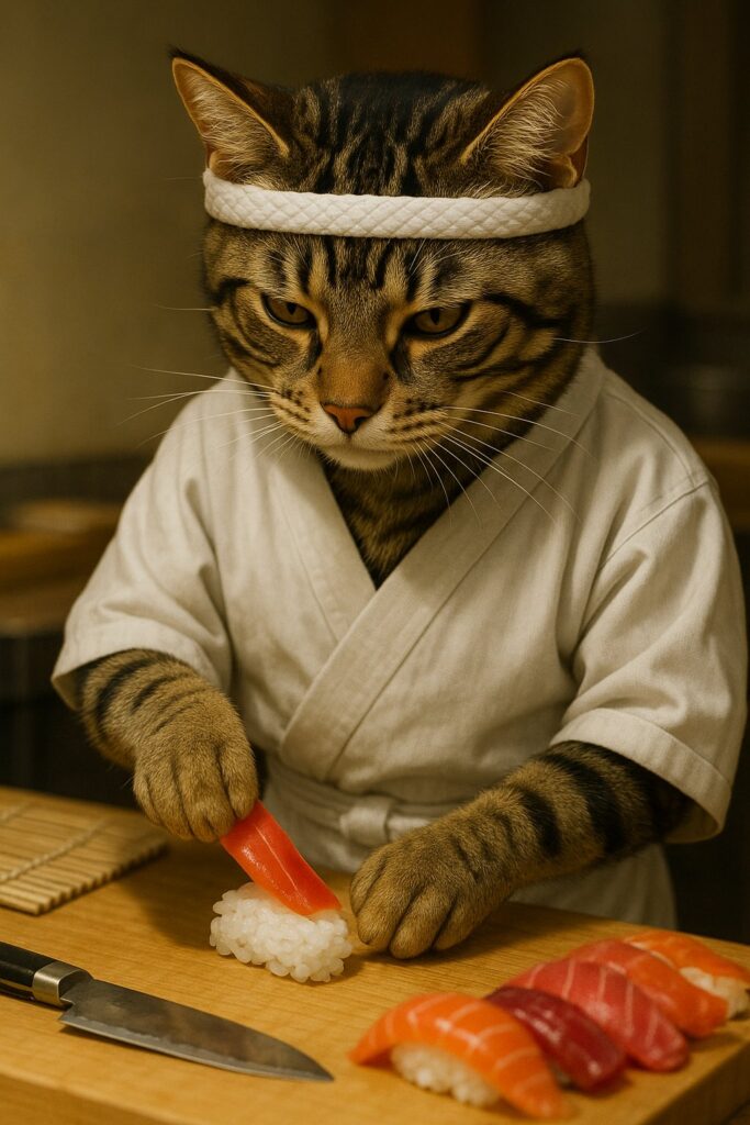 A brown tabby cat with white markings on its face, chest, and front paws is wearing a traditional Japanese sushi chef uniform and a white headband. The cat is behind a clean wooden sushi counter, carefully placing a slice of raw fish (like tuna or salmon) onto a ball of sushi rice using its natural feline front paw β not human-like hands. The catβs expression is serious and focused. On the counter are neatly arranged sushi ingredients, a bamboo mat, a sushi knife, and several completed sushi pieces. Background shows a modern, softly lit high-end Japanese restaurant interior. No blur, no distortion.