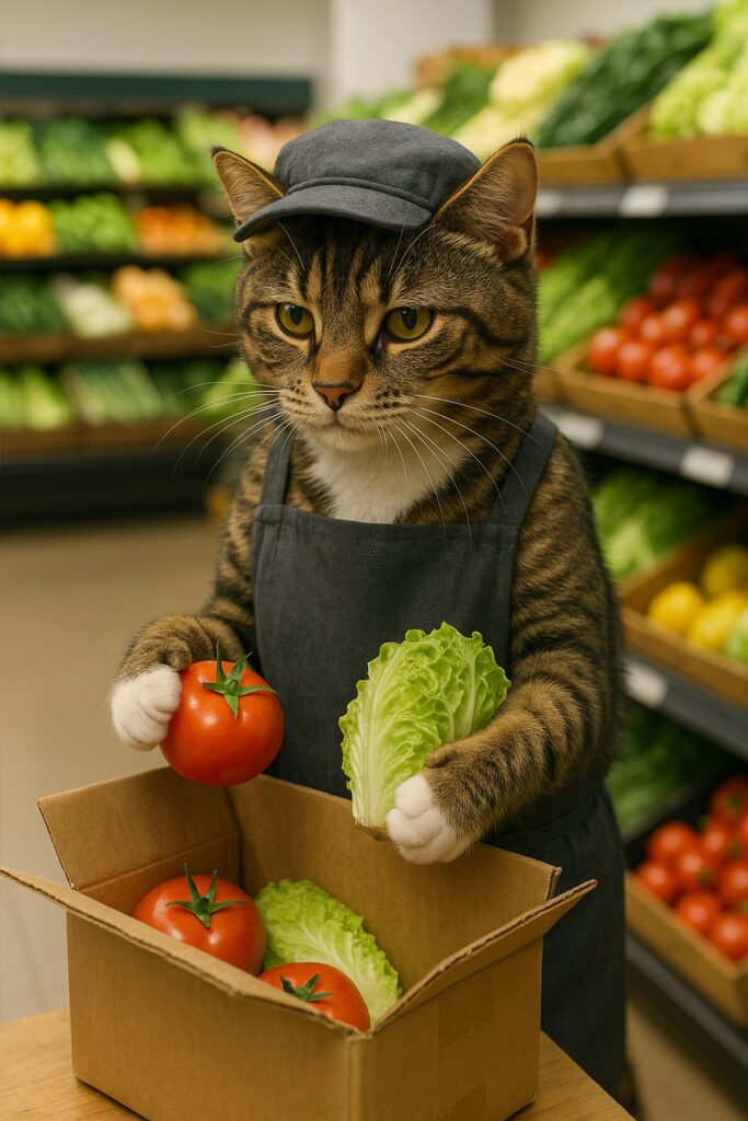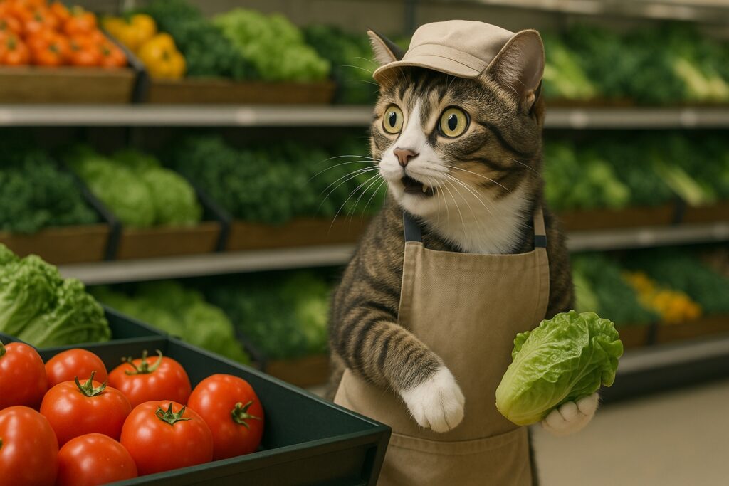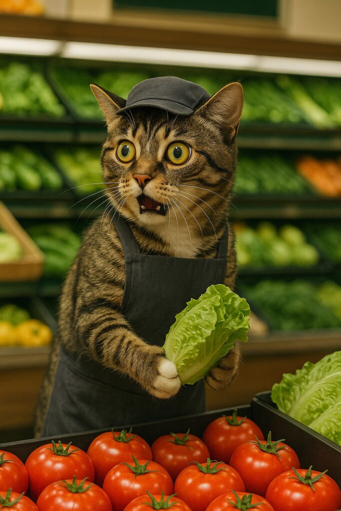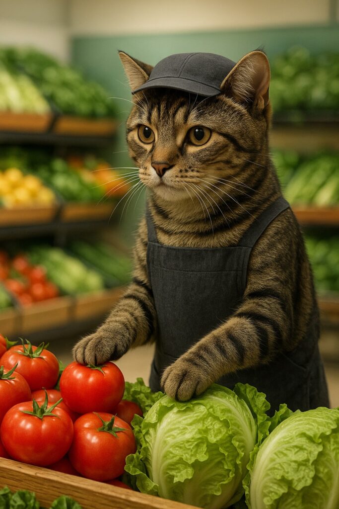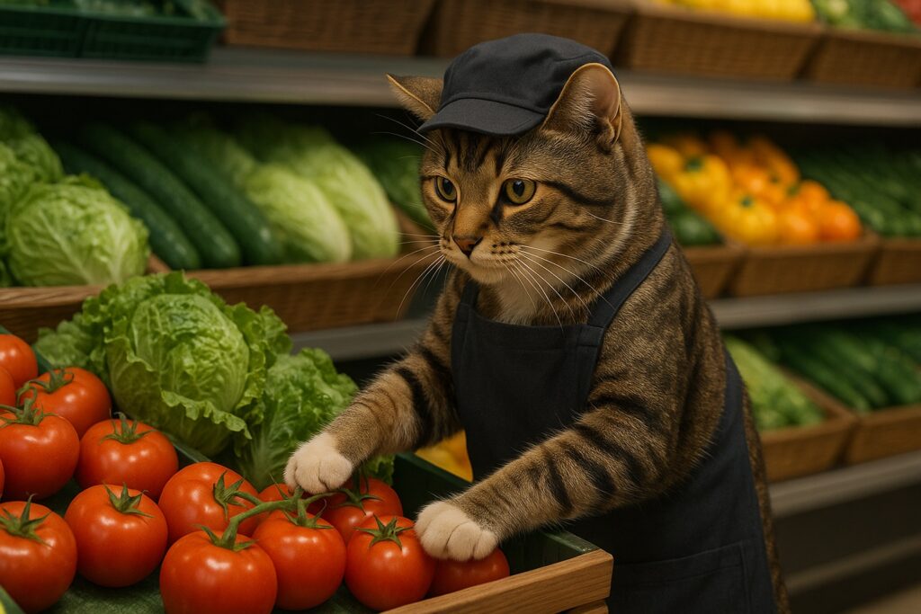 A realistic video of a bipedal tabby cat with dark brown-orange fur and distinct white markings on its face, chest, and front legs, wearing a shop worker's apron and matching cap, standing in a supermarket vegetable section. The cat carefully arranges fresh vegetables such as tomatoes and lettuce on the shelf, occasionally adjusting their position with both paws. The camera slowly pans to capture the cat’s serious and focused facial expression, with bright, clean supermarket lighting and neatly stacked vegetable displays in the background. No text.