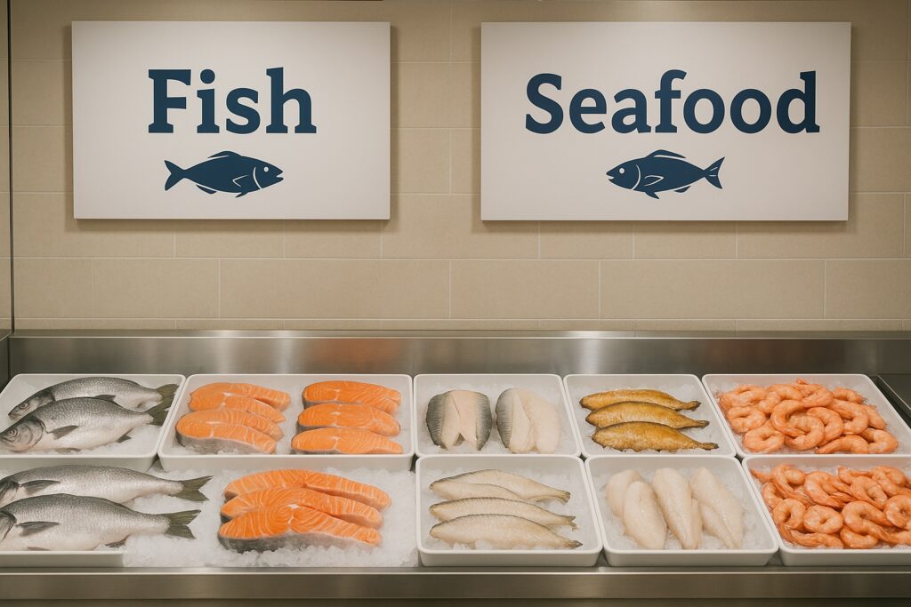 A realistic photo-style landscape orientation image showing only a fish market section in a supermarket. Fresh whole fish, fillets, grilled fish, shrimp, and other seafood are neatly displayed on ice in clean trays. Overhead signs read "Fish" or "Seafood" in English, with small fish illustrations. The arrangement is bright, colorful, and well-lit, showing a professional and inviting display. No vegetables or fruits are present. No cats or people are visible. No text other than the signs.