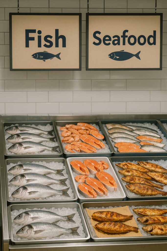 A realistic photo-style vertical portrait orientation image showing only a fish market section in a supermarket. Fresh whole fish, fillets, grilled fish, shrimp, and other seafood are neatly displayed on ice in clean trays. Overhead signs read "Fish" or "Seafood" in English, with small fish illustrations. The arrangement is bright, colorful, and well-lit, showing a professional and inviting display. No vegetables or fruits are present. No cats or people are visible. No text other than the signs.
