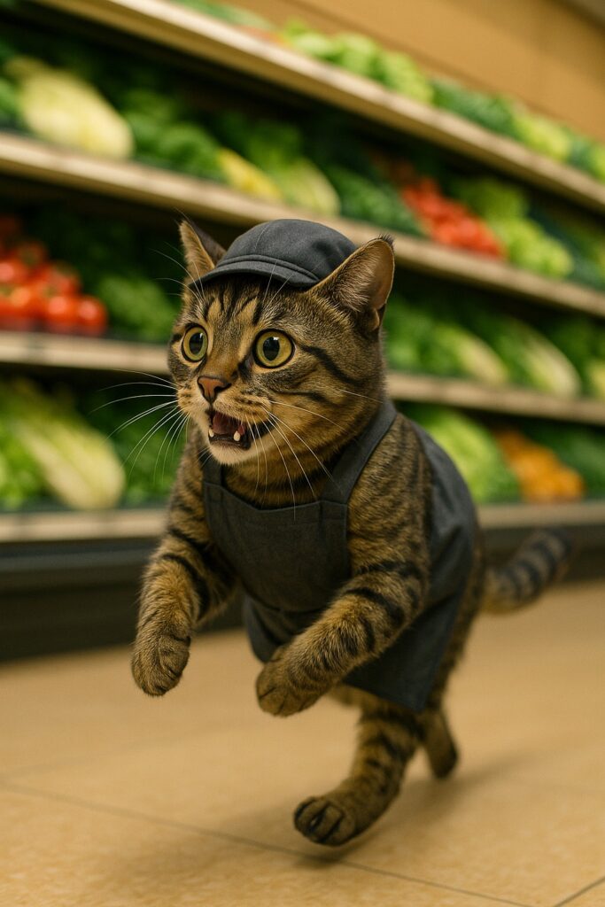 The cat runs at full speed, leaning forward with its eyes wide open and mouth slightly open in an intense, eager expression. Its legs move rapidly, and the background vegetable shelves blur to emphasize the high speed toward its unseen target.