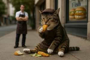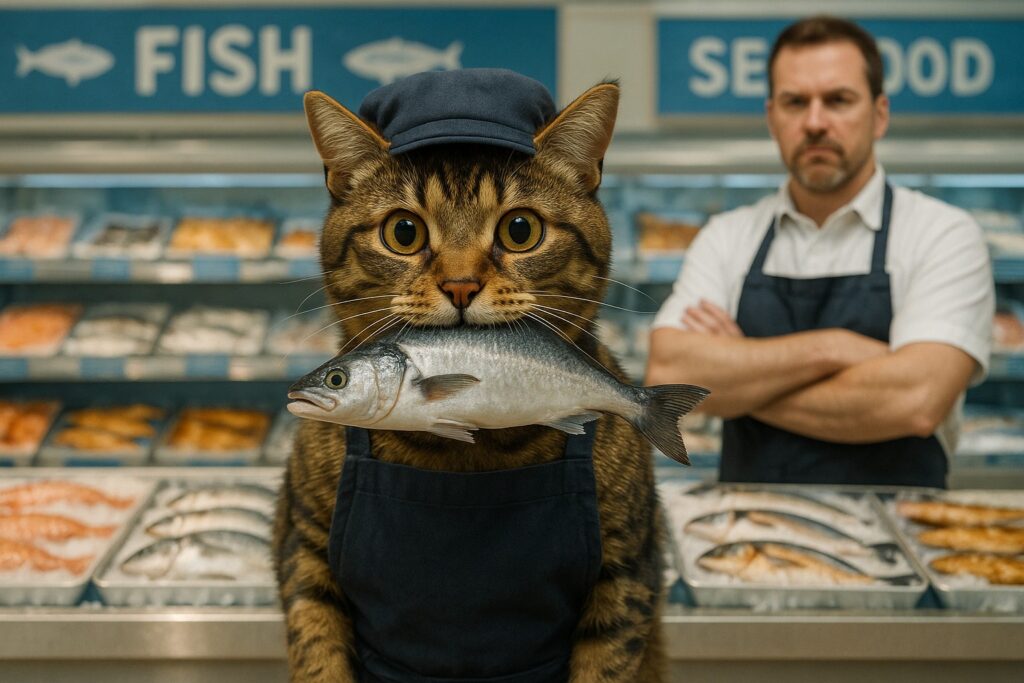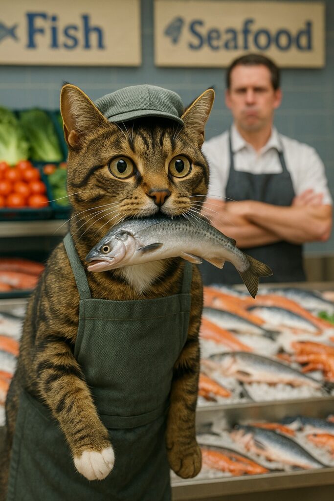 The cat stands holding a fish firmly in its mouth, glancing slightly upward with a satisfied expression. Behind it, the human fish market worker crosses their arms and sighs in annoyance. The cat’s tail flicks once as it adjusts its grip on the fish.