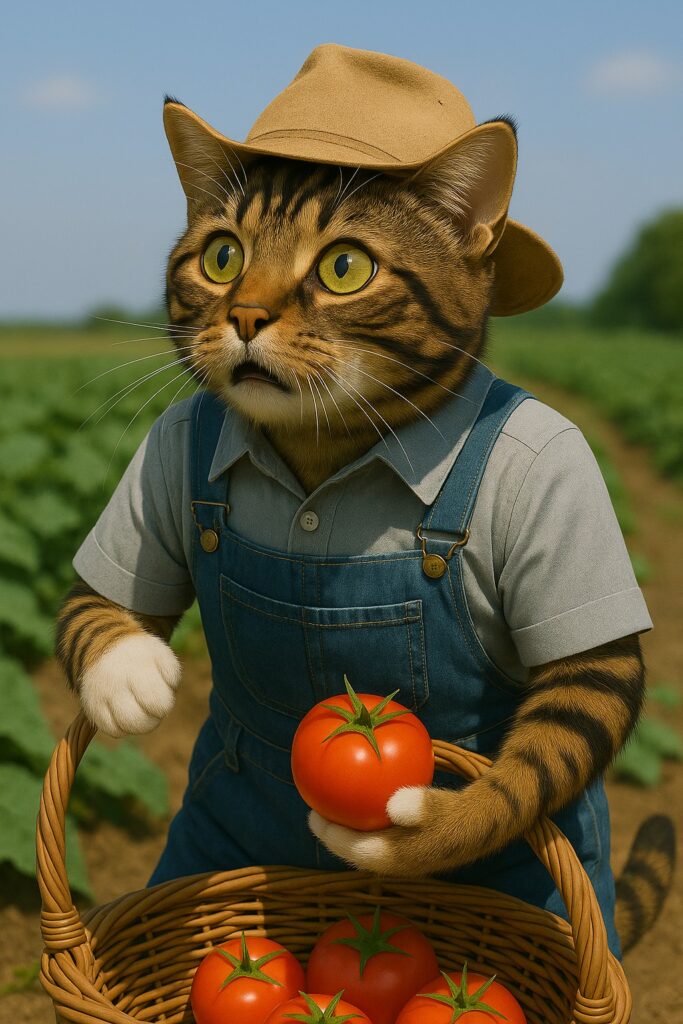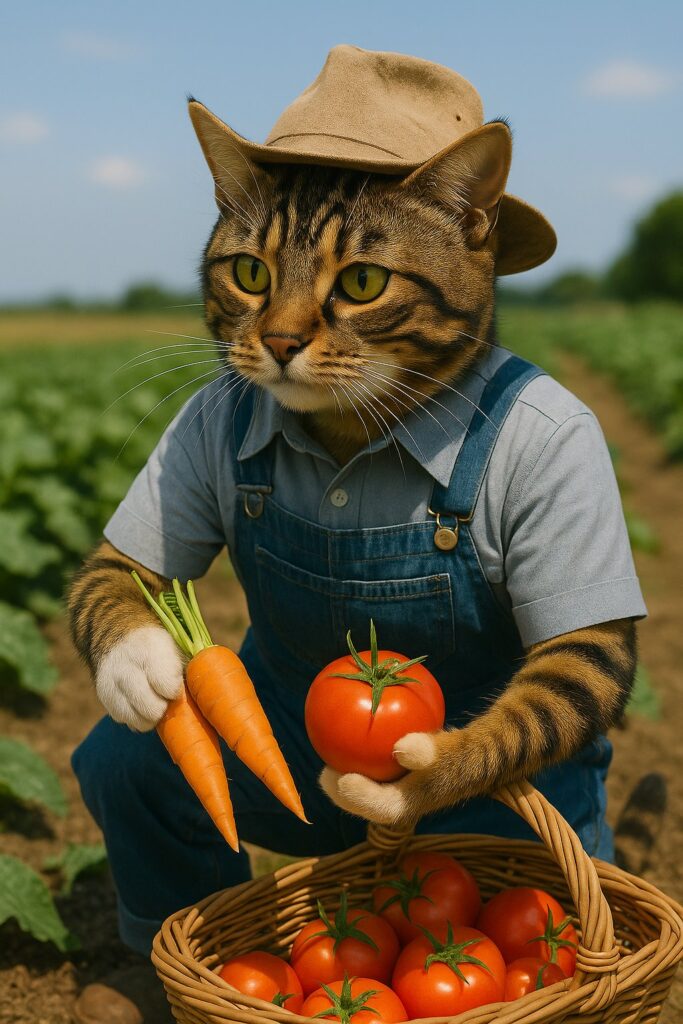 A realistic photo-style video of a bipedal dark brown-orange tabby cat with white facial, chest, and front leg markings, wearing a full-length farmer’s coverall with chest pocket and buttoned sleeves, and a straw hat with ears exposed. The cat crouches in a vegetable field, carefully picking fresh produce and placing it into a basket. The cat’s expression is focused and serious, with subtle hand and head movements as it works.