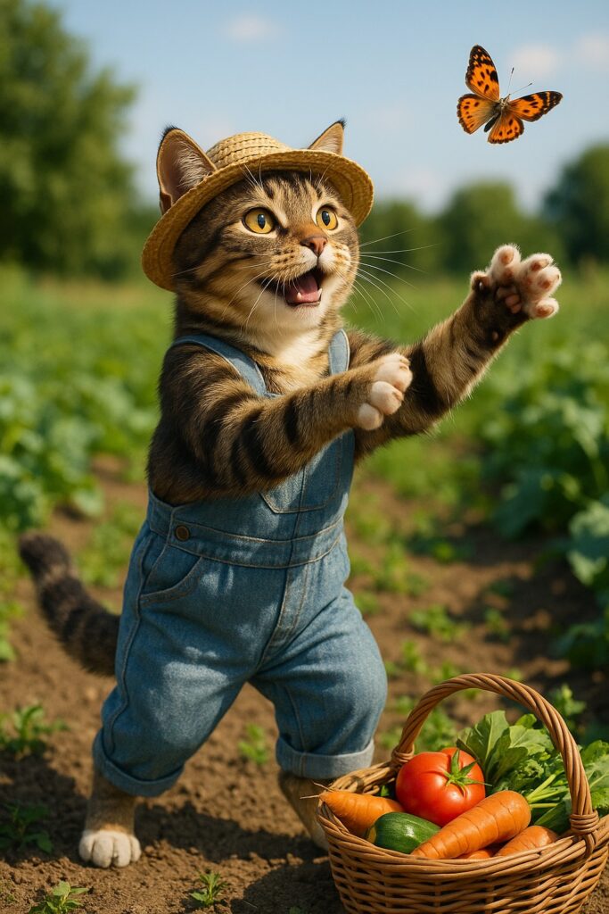 A realistic photo-style vertical portrait orientation image of a fully anthropomorphic deep dark brown-orange tabby cat with white markings on its face, chest, and front legs. The cat is wearing light blue farmer’s overalls and a wide-brimmed straw hat that allows its ears to stick out naturally. The cat stands in a green vegetable field, holding a half-filled wicker basket of freshly harvested vegetables in one hand. The cat is looking up with wide, curious eyes at a colorful butterfly flying just above its head, showing an expression of fascination. The butterfly is mid-air with wings open. Bright natural daylight. No text.
