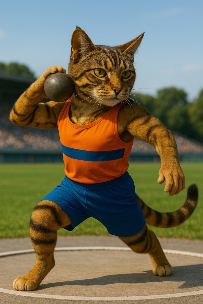 The cat positions itself for the shot put, bringing the shot near its neck, twisting its body, and then launching it forward with a strong push. The tail moves naturally for balance during the motion. Movements are powerful and smooth.