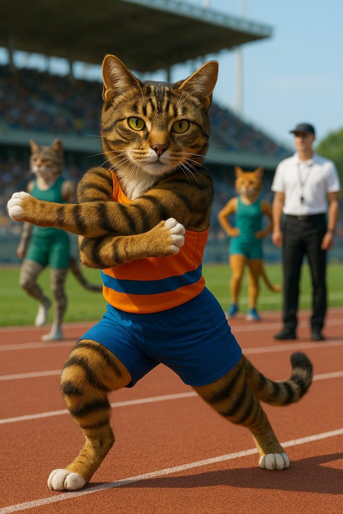 The cat stretches its arms and legs in preparation for competition, shifting weight slightly from side to side, occasionally glancing toward the track with determination. Other cat athletes in the background also move subtly, and the human referee adjusts their stance. Movements are smooth and natural.