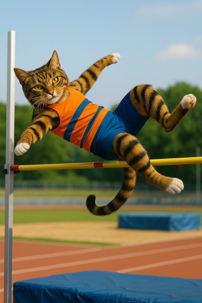 The cat runs toward the high jump bar, plants its feet, then leaps into the air using the Fosbury Flop technique, arching its back and clearing the bar. The tail swishes naturally as the cat passes over the bar, then lands on the mat. Movements are smooth and natural.