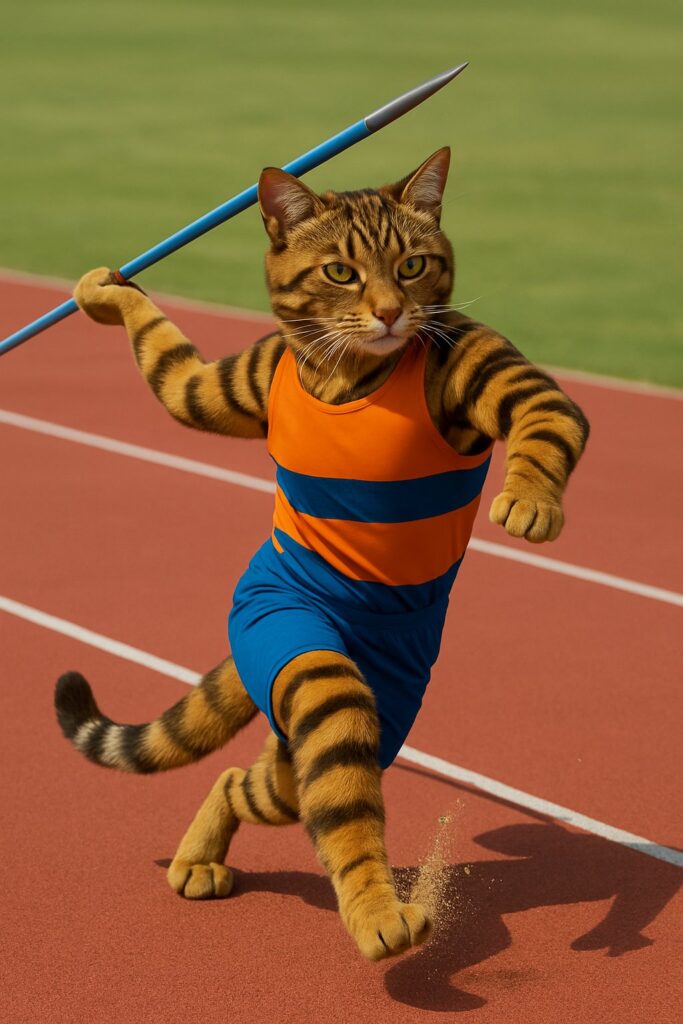The cat in full javelin throwing motion β starting from the stance, then stepping forward and powerfully launching the javelin, with dynamic body rotation and follow-through.