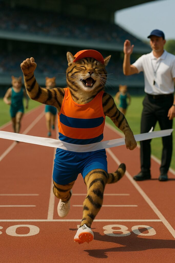 The cat sprints the final meters of the 800m race, breaking the finish tape with its chest. The tape snaps dramatically. The catβs body leans forward, breathing heavily, arms pumping strongly. Other cat athletes are chasing from behind, and a human referee stands beside the finish line, signaling the finish. Movements are intense and natural.
