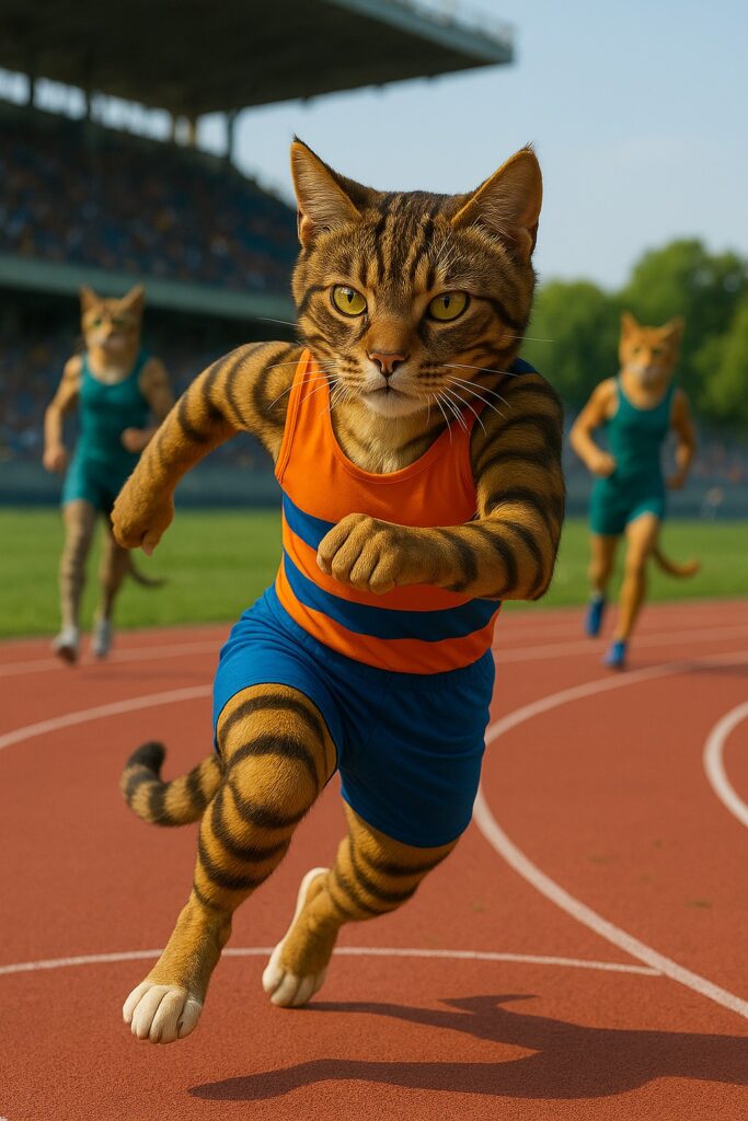 The cat runs at full speed on the curved section of the 200m track, arms pumping and tail streaming behind for balance. Other cat athletes follow behind in the background, also sprinting. Movements are smooth, fast, and full of energy.