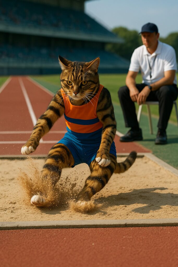 The cat sprints toward the takeoff board, jumps powerfully into the air, extending its legs forward and arms back for balance, then lands in the sandpit, kicking up sand. Movements are smooth, dynamic, and athletic.