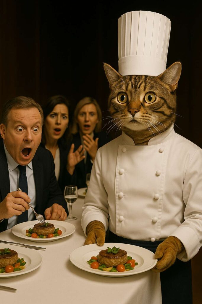 The atmosphere is festive and triumphant, highlighting the cat chef’s victory.