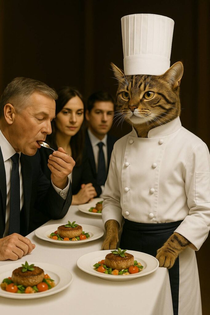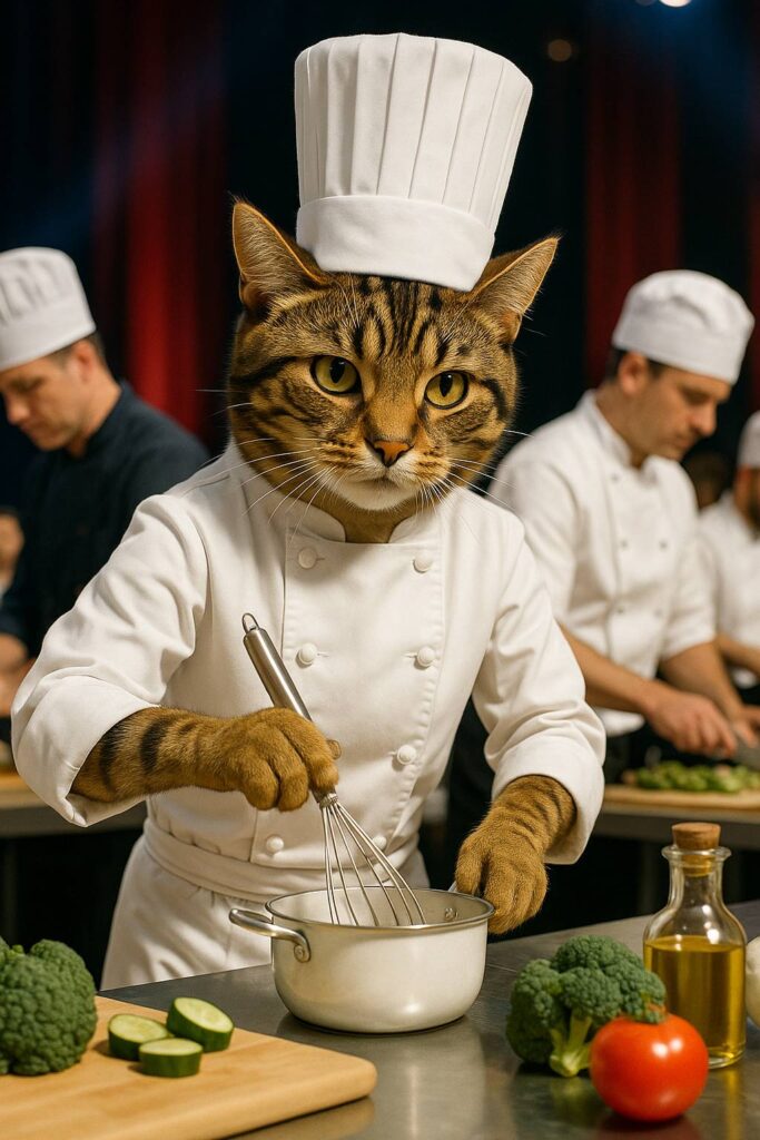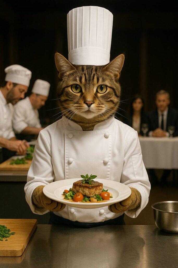 The cat chef, standing proudly to the side in a chef’s uniform, observes with confidence.