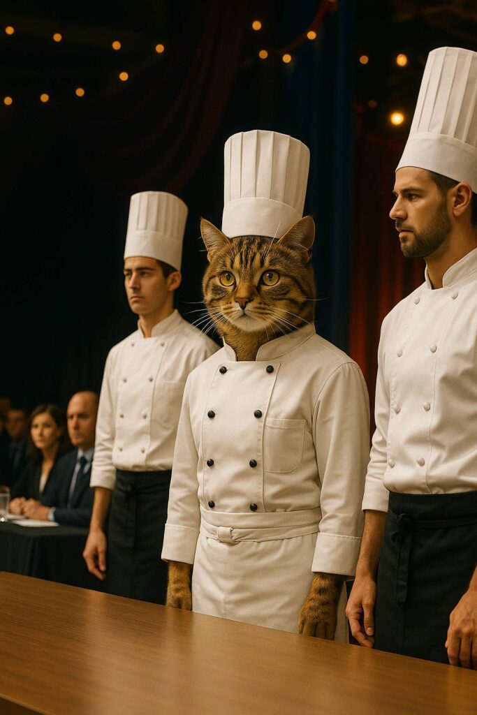 On the right side of the scene, the anthropomorphic cat chef wearing a tall chef’s hat and white chef’s uniform stands proudly with realistic cat paws, observing the judges.