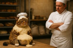 On the right side of the scene, the anthropomorphic cat chef, wearing a tall chef’s hat and a white chef’s uniform, stands proudly with realistic cat paws, watching the scene confidently.