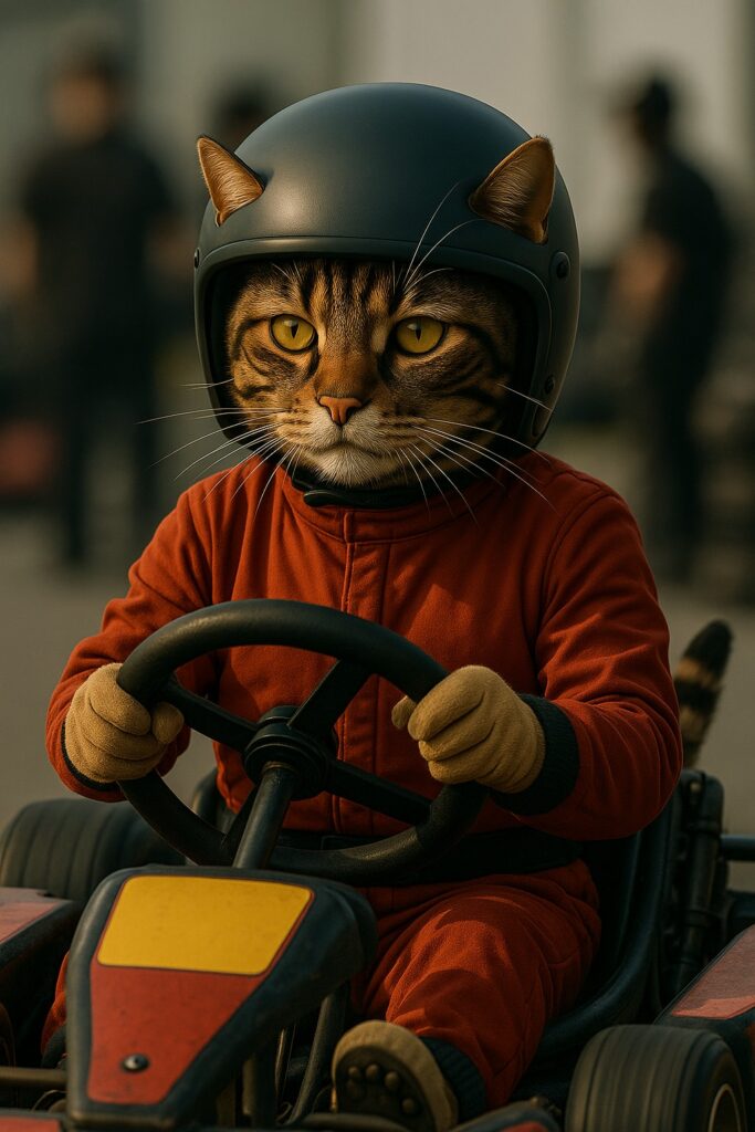 The cat wears a simple racing jacket and a fitted helmet shaped for cat ears.