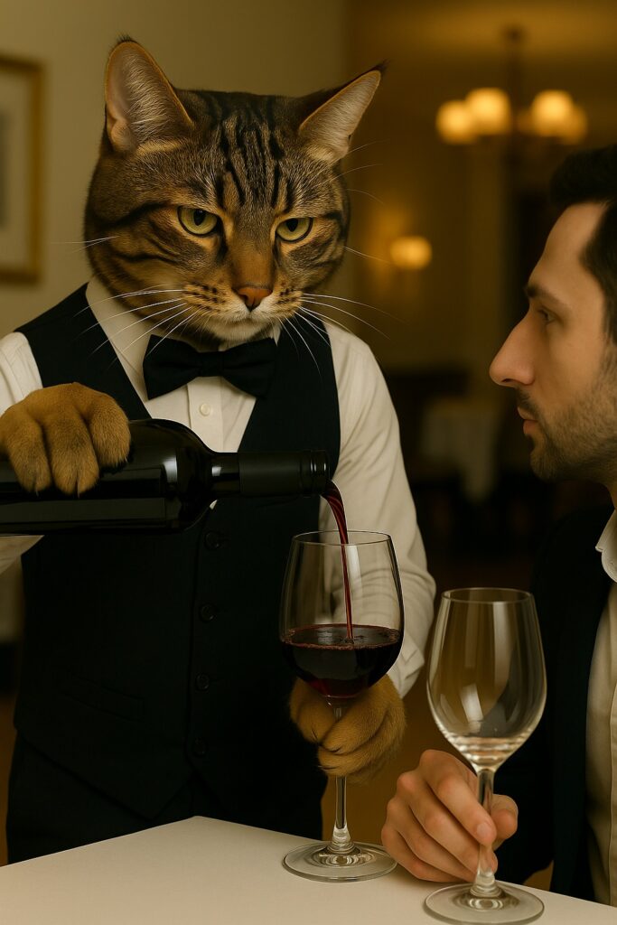 The cat carefully tilts the wine bottle, pouring red wine into the guest’s glass, with a serious and professional expression.