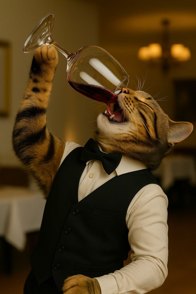 Red wine is visibly flowing out of the bottle into the cat’s mouth.