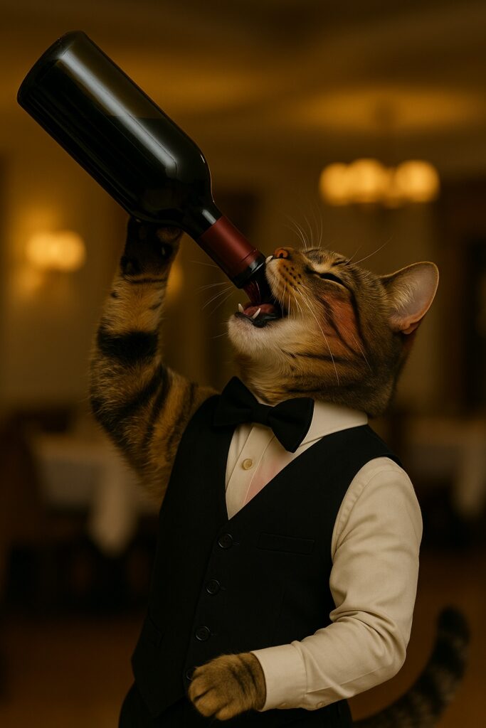 The cat tilts the wine bottle and drinks straight from it, with red wine flowing into its mouth and a joyful, tipsy expression with a slight blush.