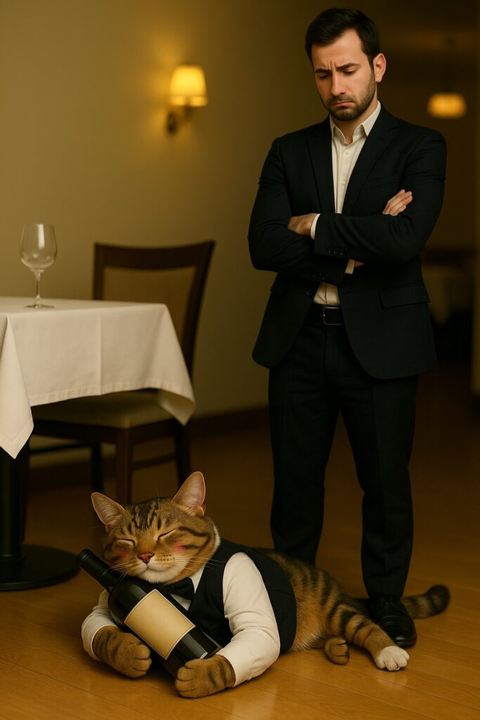The cat lies on the restaurant floor, hugging a wine bottle, clearly drunk and asleep, with a satisfied expression and a blush on its face.
